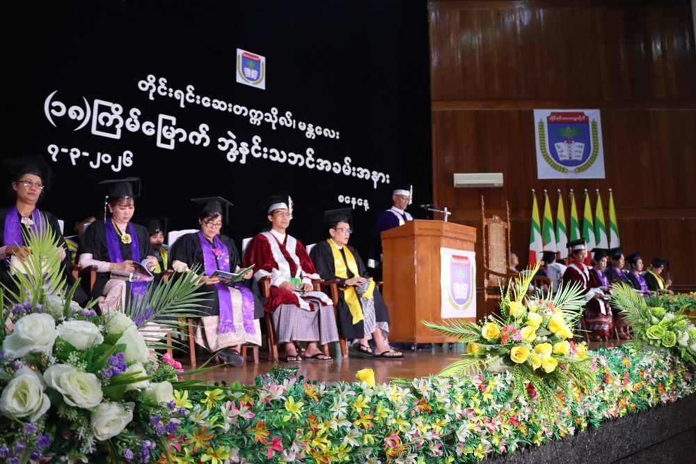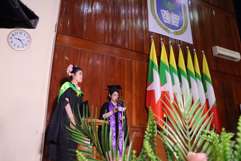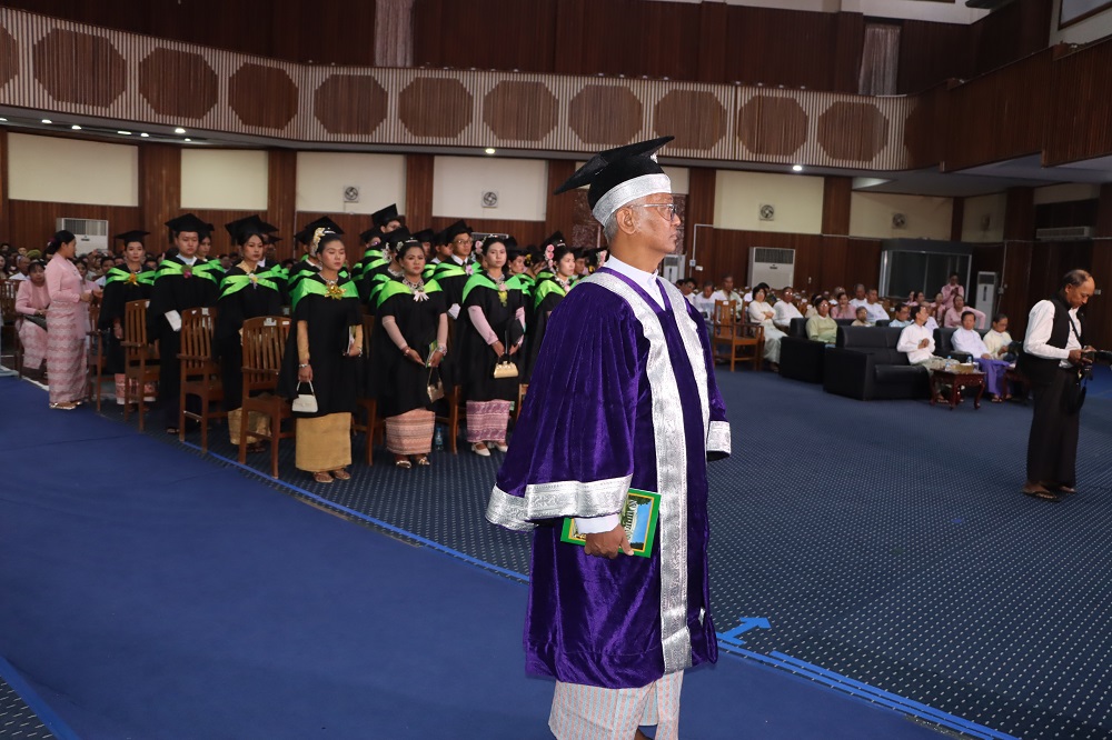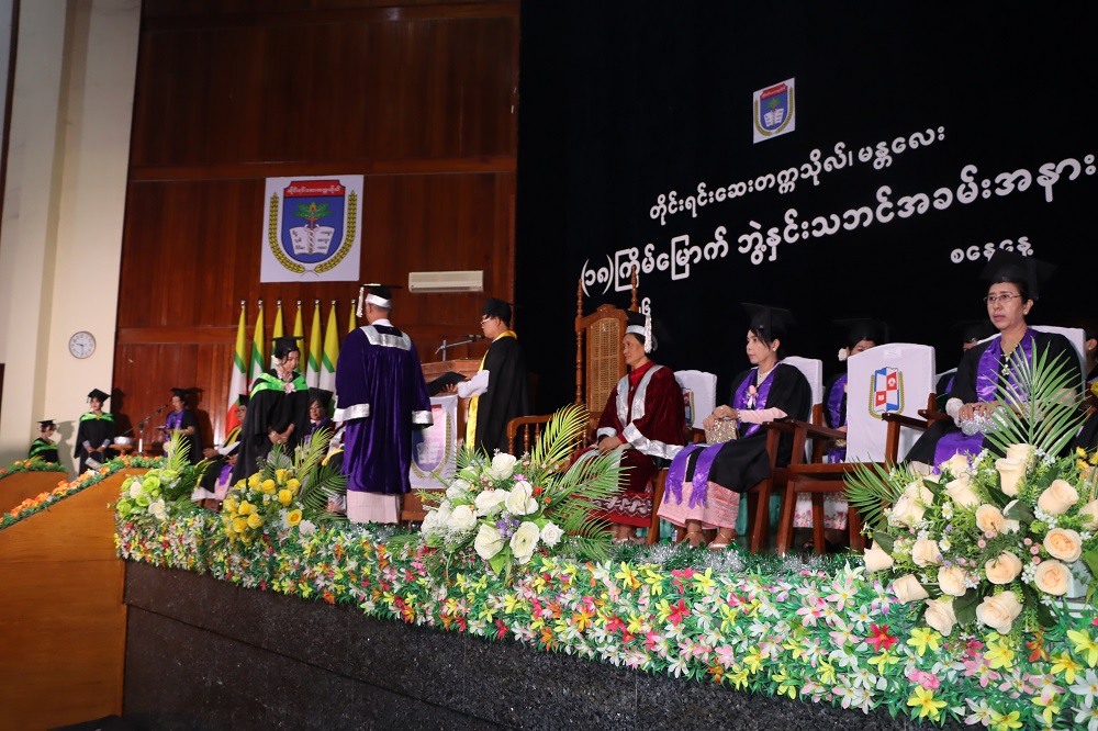 ထို့နောက် ပါမောက္ခဒေါက်တာသိန်းဇော်လင်းက ဘွဲ့နှင်းသဘင်မိန့်ခွန်းကို ပြောကြားကာ ဘွဲ့နှင်းသဘင်အခမ်းအနားကို ရုပ်သိမ်းလိုက်သည်။